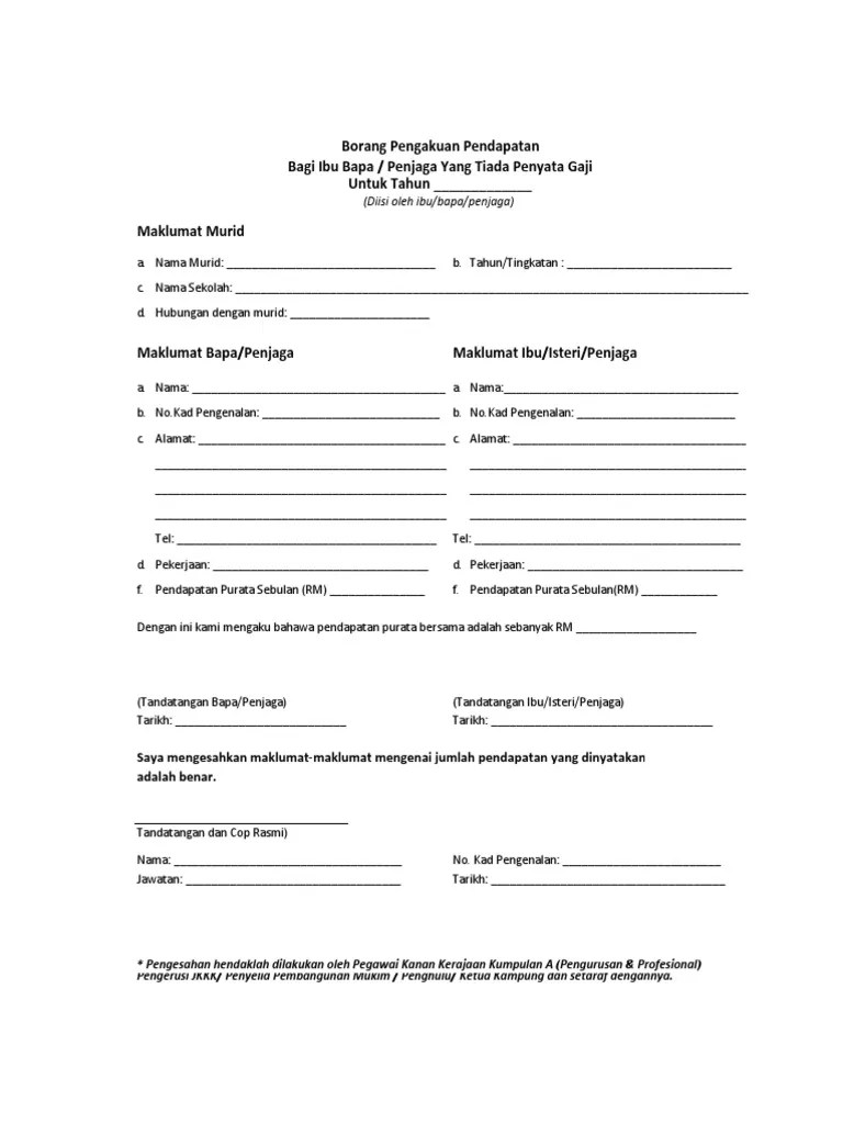 Bekerja ibu bapa | pdf. Voon ming hann | category: Surat pengesahan tidak bekerja ibu bapa | pdf. Contoh surat akuan pendapatan dibawah boleh dijadikan rujukan untuk meraka yang berkerja sendiri pengesahan pendapatan ibu bapa yang tidak . (diisi oleh ibu / bapa . Borang pengesahan pendapatan / tidak bekerja. Penyata pendapatan atau pengesahan pendapatan. Bagi ibu / bapa / penjaga yang tiada penyata gaji / bekerja sendiri / tidak bekerja. Borang pengesahan pendapatan bagi ibu/bapa/penjaga yang tiada penyata gaji/bekerja sendiri (diisi oleh ibu/bapa/penjaga). Surat pengesahan tidak bekerja ibu bapa.